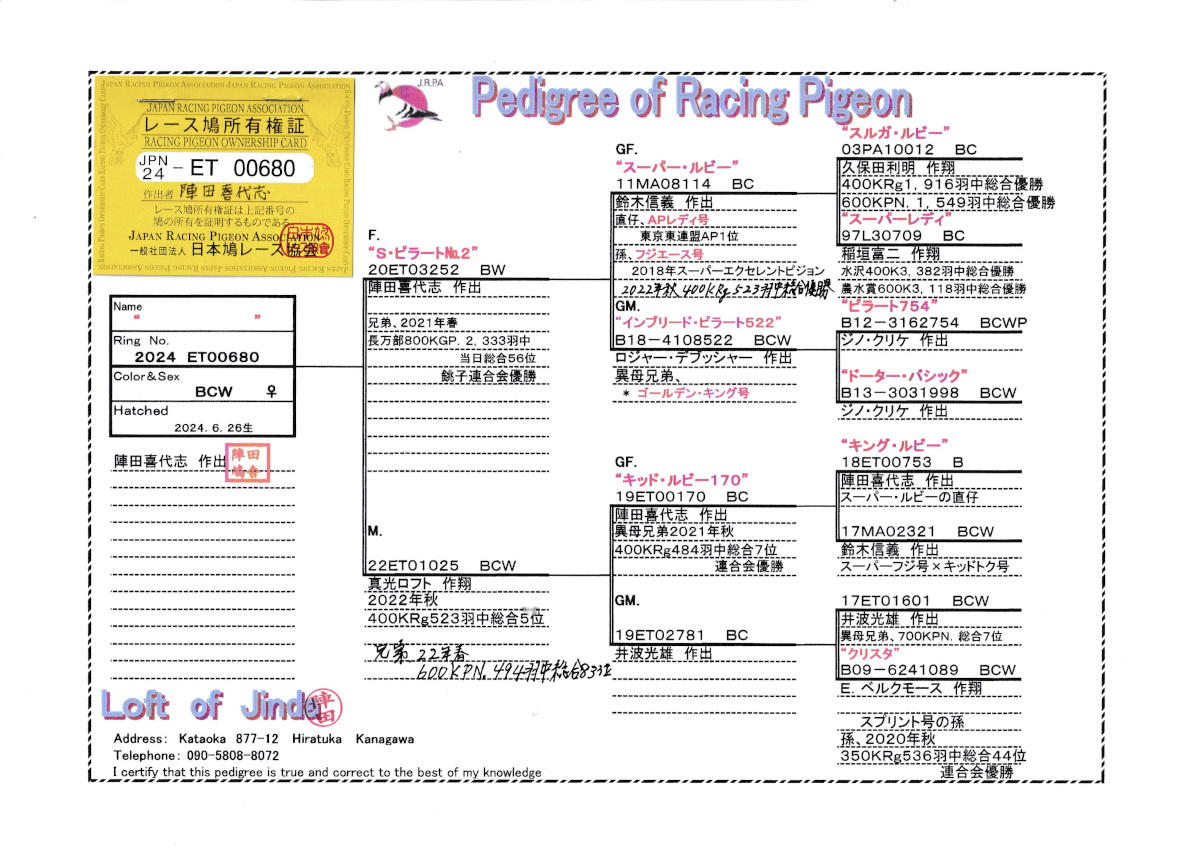 出品鳩♀37番「24ET00680 BCW♀」陣田喜代志作GP800K優勝兄弟&スーパールビー号(スルガルビー×スーパレディ)×真光作翔RG400K523羽総合5位 ![]() |