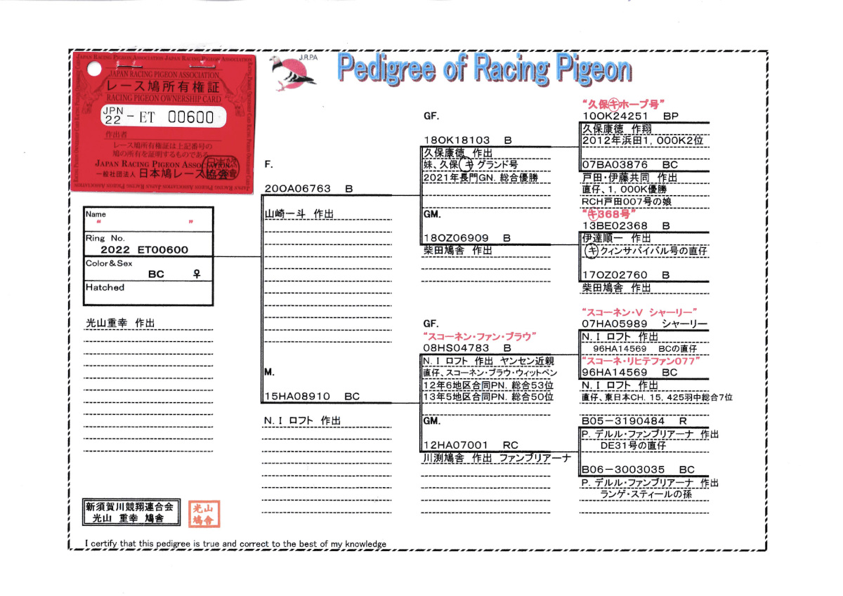 出品鳩♀33番「22ET00600 BC♀」光山重幸作山崎作〇キ系久保〇キGN号長門GN総合優勝兄弟直仔×NI作6地区N総合53位半兄弟(ヤンセン系×ファンブリアーナ系) ![]() |