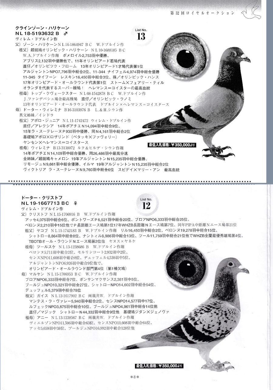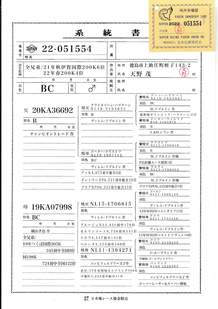出品鳩「日22−51554 BC♂」天野作全兄弟)伊賀国際200k6位両親ドブルイン作(オリンピックハリケーン号孫×ブロアNPO25位)×ブールジュN13431羽176位娘 ![]() |
