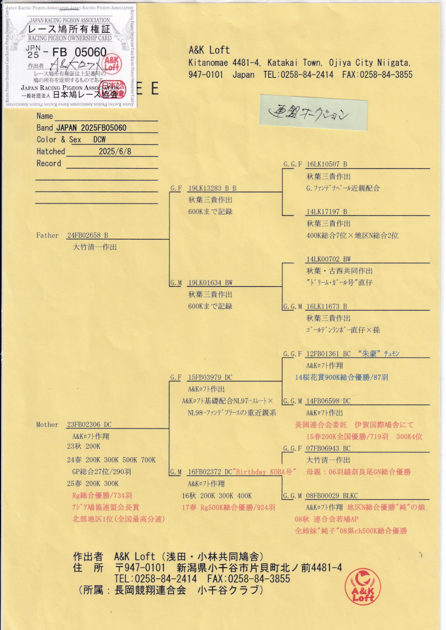 新潟連盟運営資金調達出品鳩「25FB05060 DCW」A&Kロフト作 25年RG500K734羽総合優勝&アジア鳩協連盟会長賞北部地区1位鳩の直仔 ![]() |