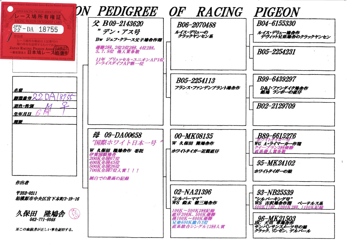 出品鳩「22DA18755 M♀」久保田 隆作デン・アス号優勝2回2位3位4位各2回他11年二種AP1位鳩×国際ホワイト日本一号伊賀国際700K全国7位 ![]() |