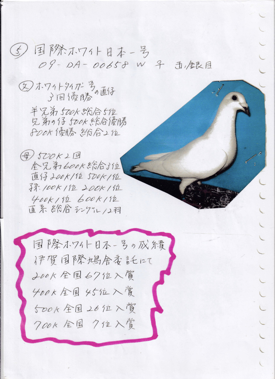 出品鳩「22DA18755 M ♀」久保田 隆鳩舎作デン・アス号ジェフ・クラース父子作翔 優勝2回2位3位4位各2回他11年二種AP1位鳩×国際ホワイト日本一号伊賀国際200k67位400k45位500K26位700K全国7位鳩 との直仔です。 父親 "デン・アス号"「B09−2143620 BW」ジェフ・クラース父子鳩舎作翔 優勝2回2位3位4位各2回他11年二種AP1位鳩で クラックヤンセン系×ランボー号孫鳩 との直仔です。 母親 "国際ホワイト日本一号"「09DA00658 W」久保田 隆鳩舎作委託 伊賀国際200k67位400k45位500K26位700K全国7位鳩で ホワイトタイガー号3回優勝親娘掛け直仔×鈴木作シルバーママ号(ペーテルス系1100k鳩×サンバンサンスメーツ号娘鳩 との直仔です。 詳しくは、血統書を参照してください。 <備考> 現在管理人の鳩舎で元気に暮らしています。写真3/2日に撮影しました。 菅原明鳩舎の概要はこちらをご覧ください |