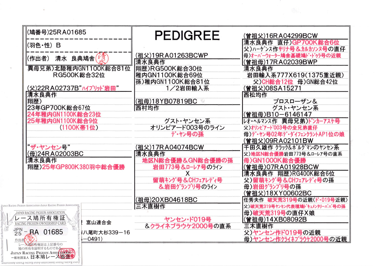 出品鳩若75番「25RA01685 B」清水良典鳩舎作異母兄弟に北陸GN1100K総合81位鳩がいるハイブリッド岩田号25年北陸稚内GN1100K総合9位(1100k地帯1位)24年北陸GN総合23位鳩×ザ・ヤンセン号25年北陸GP800K380羽中総合優勝鳩 との直仔です。 父親 ♂39番"ハイブリッド岩田号"「22RA02737 B ♂」清水良典鳩舎作翔25年北陸稚内GN1100K総合9位(1100k地帯1位)24年北陸GN総合23位鳩で 直仔も北陸GN1100K総合81位入賞している 3代稚内GN1100k入賞鳩の二代目鳩です。 母親 "ザ・ヤンセン号"「24RA02003 BC」清水良典鳩舎作翔 25年北陸GP800K380羽中総合優勝鳩で (地区N総合優勝GN総合優勝孫&岩田773号ローレア号ライン×留萌キング号&CHフェアレディ号&岩田グランプリ号ライン鳩)直仔×三木作ヤンセン鳩舎ド019号&クライネブラエ2000号直系鳩 との直仔です。 詳しくは、血統書を参照してください。 <備考> 現在管理人の鳩舎で元気に暮らしています。写真3/5日に撮影しました。 菅原明鳩舎の概要はこちらをご覧ください |