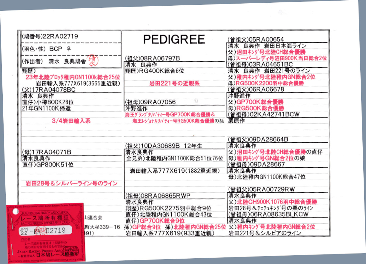 出品鳩♀46番「22RA02719 BCP♀」清水良典作翔23年北陸GN1100K総合25位半兄弟)小樽800K28位鳩GP800k51位 岩田輸入系(777×619)3665重近親 ![]() |