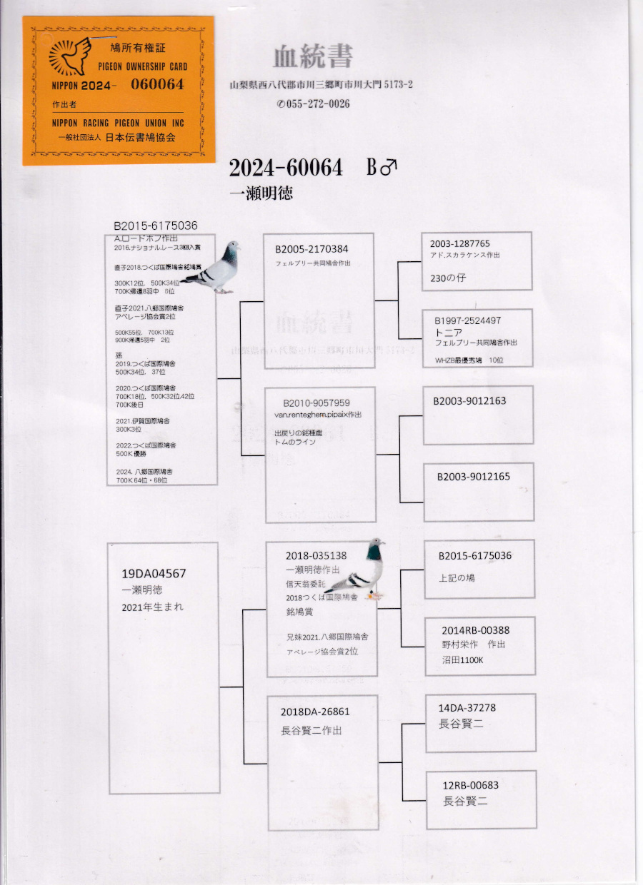 出品鳩♂44番「日24−060064 B♂」一瀬明徳作半兄弟)つくば国際銘鳩賞受賞鳩八郷国際協会賞2位鳩ロードホフ作翔Nレース3回入賞×つくば国際銘鳩賞受賞の娘 ![]() |