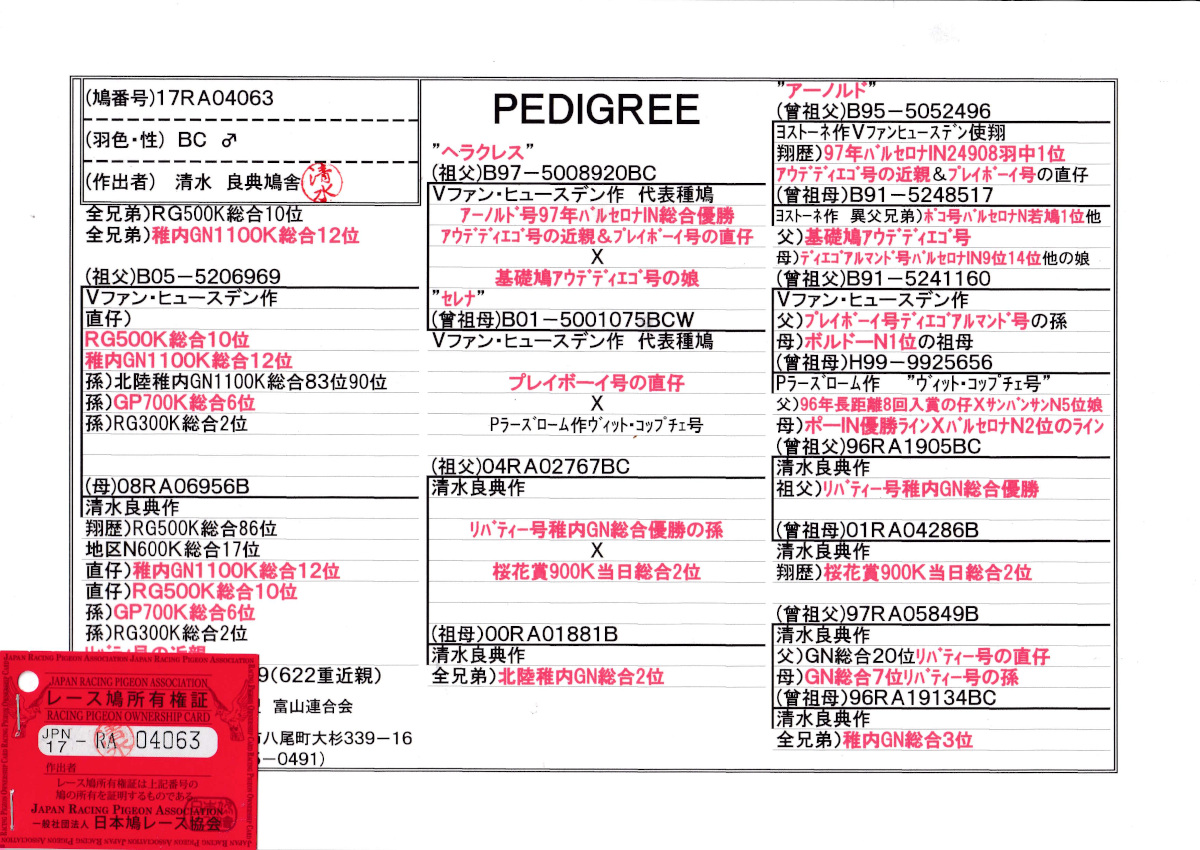 出品鳩♂14番「17RA04063 BC♂」清水良典作全兄弟)稚内GN1100K総合12位鳩RG500K総合10位鳩 アーノルド号孫×PN総合17位&シバティ号GN総合優勝近親 ![]() |