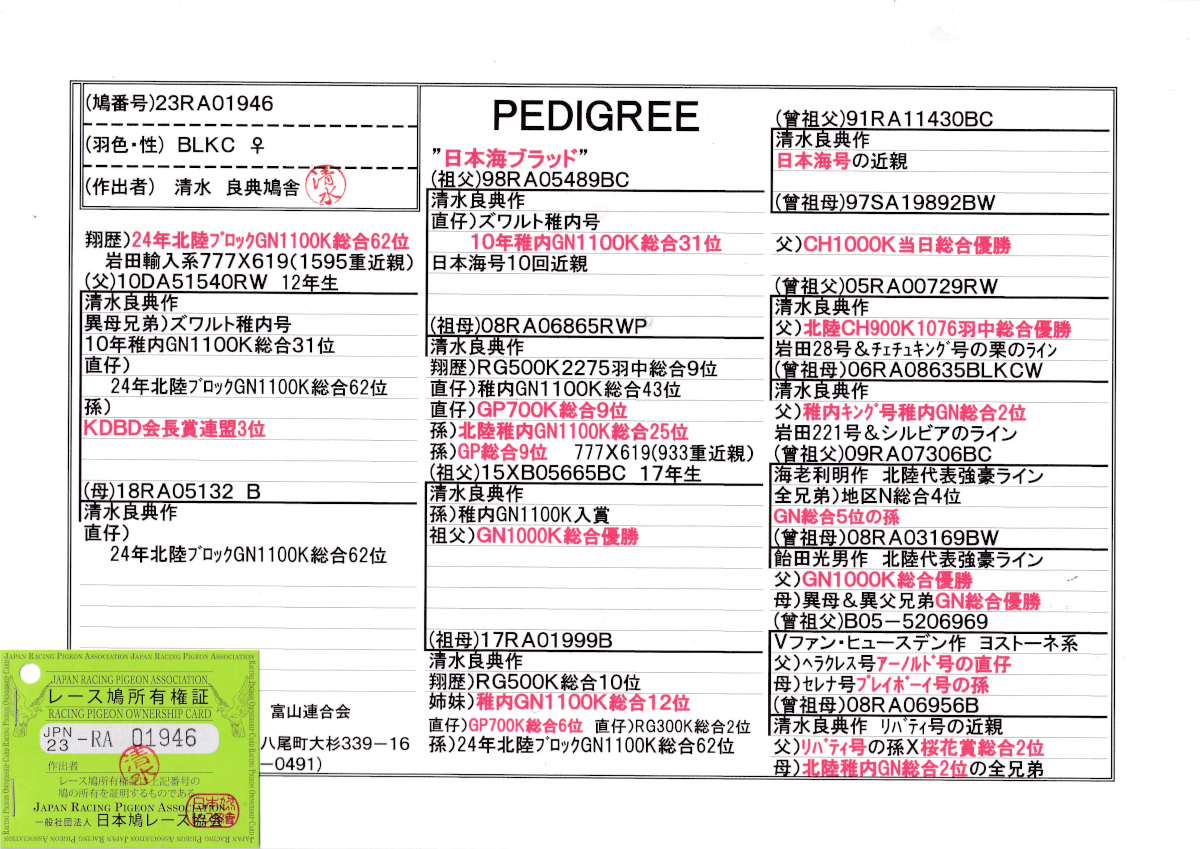 出品鳩♀50番「23RA01946 BLKC♀」清水良典作翔 24年北陸稚内GN1100K総合62位鳩で 岩田輸入系(777X619)1595重近親鳩 ![]() |