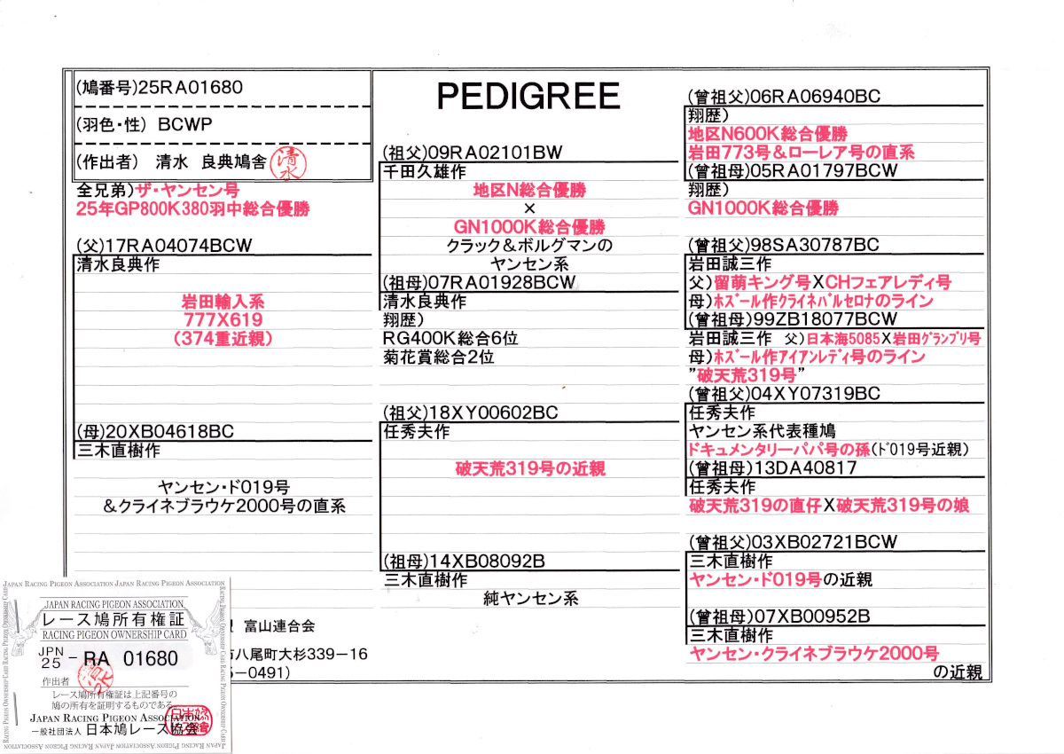 出品鳩若70番「25RA01680 BCWP」清水良典鳩舎作 "ザ・ヤンセン号"25年北陸GP800K380羽中総合優勝鳩の全兄弟鳩 ![]() |