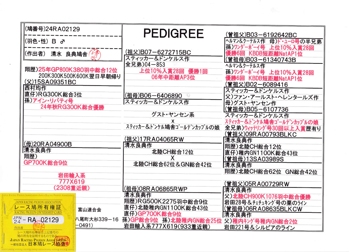 出品鳩♂46番「24RA02129 B♂」清水良典作翔北陸GP800K総合12位半兄弟)RG300K総合3位鳩 両親ドンケルス作鳩×GP700K総合9位岩田系(777×619)2308重近親 ![]() |