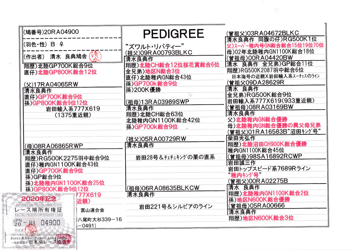 出品鳩♀40番「20RA04900 B♀」清水良典作翔GP700K総合9位 直仔)GP800K総合12位 半兄弟)北陸GN1100K総合43位 岩田輸入系(777×619)2308重近親鳩 ![]() |