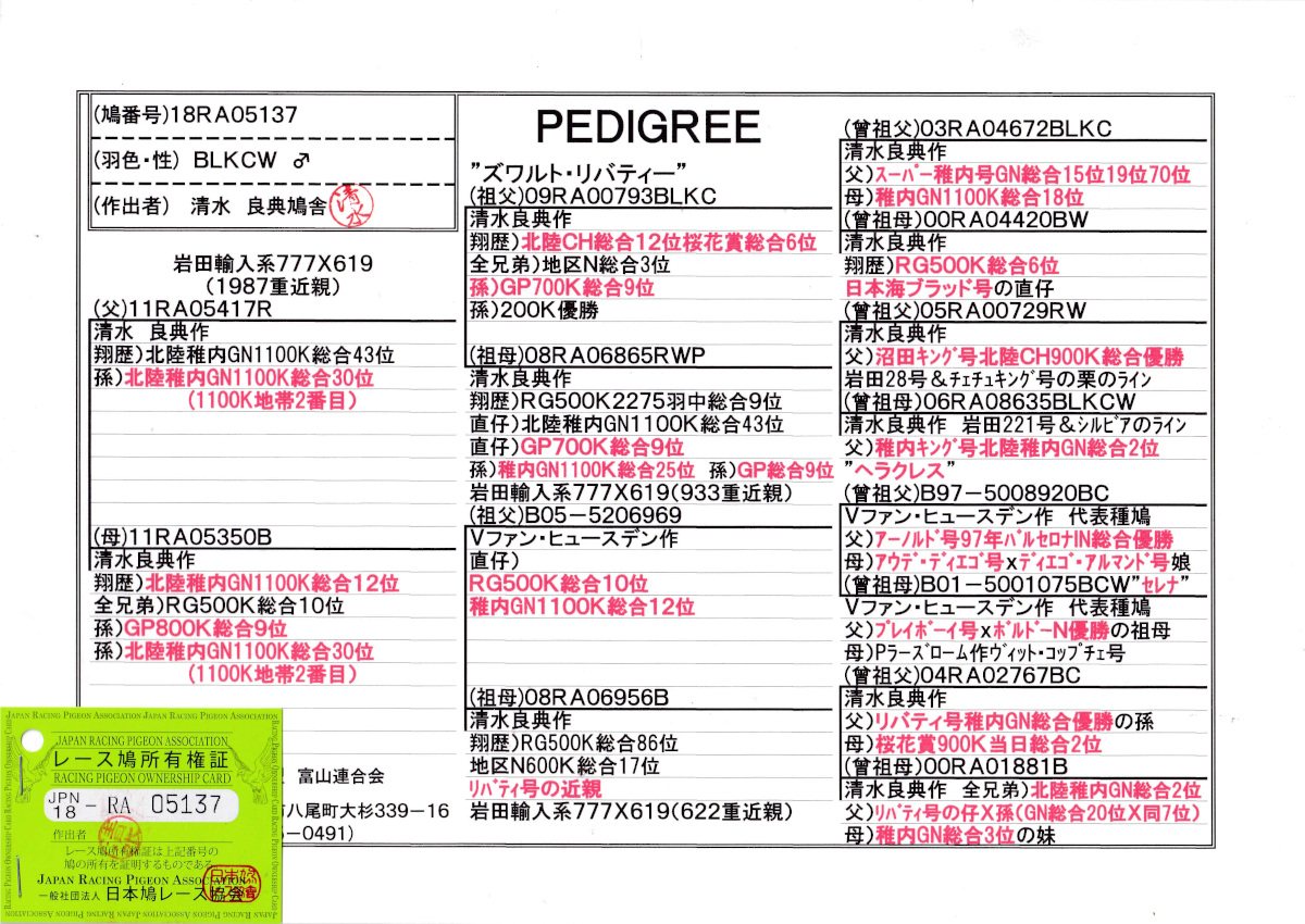出品鳩♂21番「18RA05137 BLKC♂」清水良典作半兄弟)RG総合2位鳩GP総合6位鳩 北陸GN総合43位(ズワルト・リバティ号直仔)×北陸GN総合12位 ![]() |