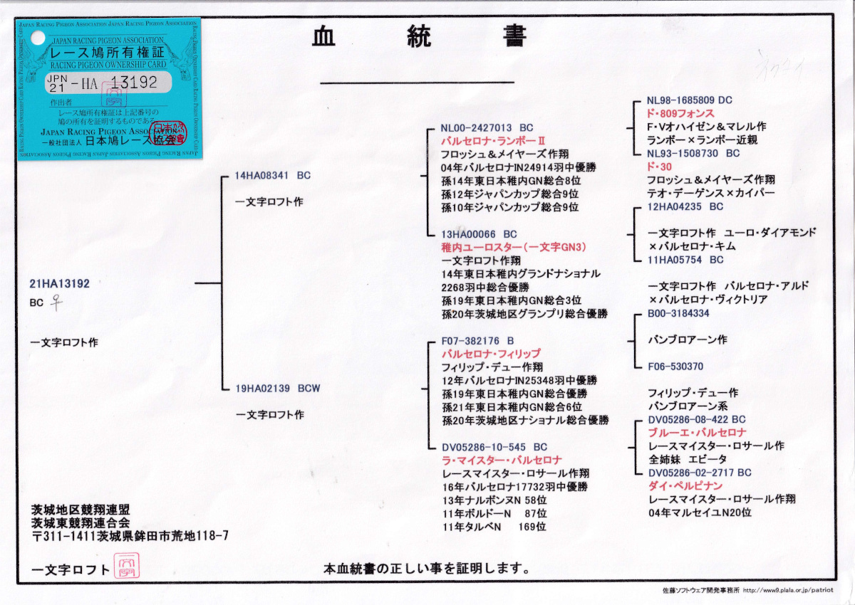 出品鳩♀42番「21HA13192 BC♀」一文字作(バルセロナ・ランボーU号X稚内ユーロスター号)×(ユーロダイヤモンド号×バルセロナ・ネリー号) ![]() |