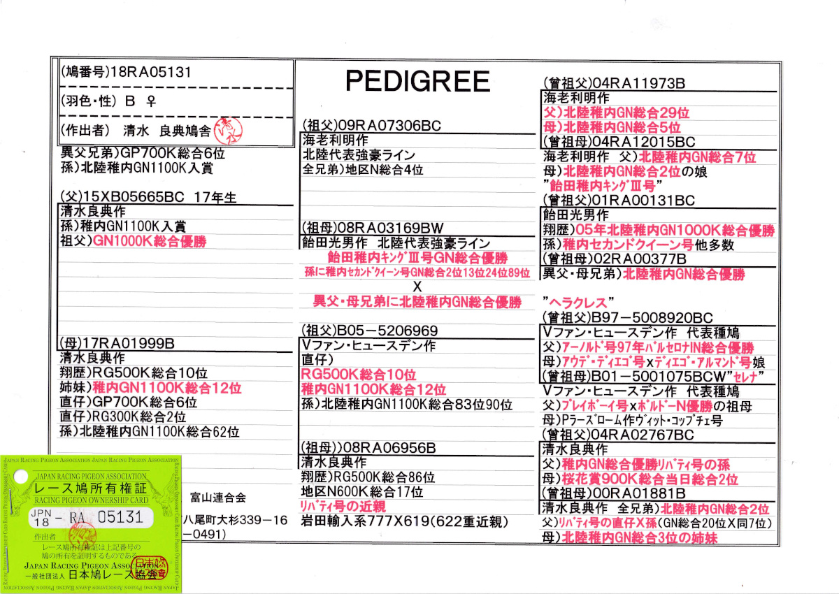 出品鳩♀20番「18RA05131 B♀」清水良典作半兄弟)RG総合2位鳩GP総合6位鳩(海老稚内系PN総合4位兄弟X飴田稚内キングV娘)×RG総合10位(兄弟GN総合12位) ![]() |