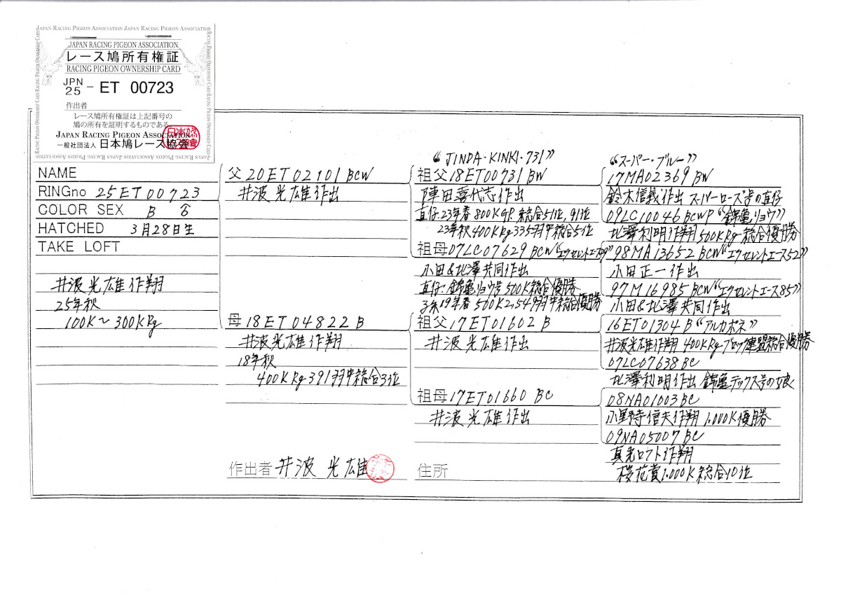 出品鳩若11番「25ET00723 B」井波光雄作翔300k迄錦亀リョウ号RG500K3724羽総合優勝異父兄弟×秋Rg400K391羽総合3位(アルカポネ号直仔×桜花賞総合10位娘) ![]() |