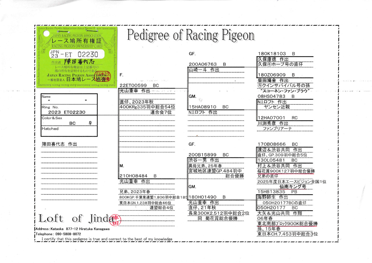 出品鳩♀36番「23ET02230 BC♀」陣田喜代志作半兄弟)秋RG400K総合54位両親光山作(久保〇キホープ号浜田1000k2位孫×NIヤンセン系)×東日本GN総合46位兄弟 ![]() |