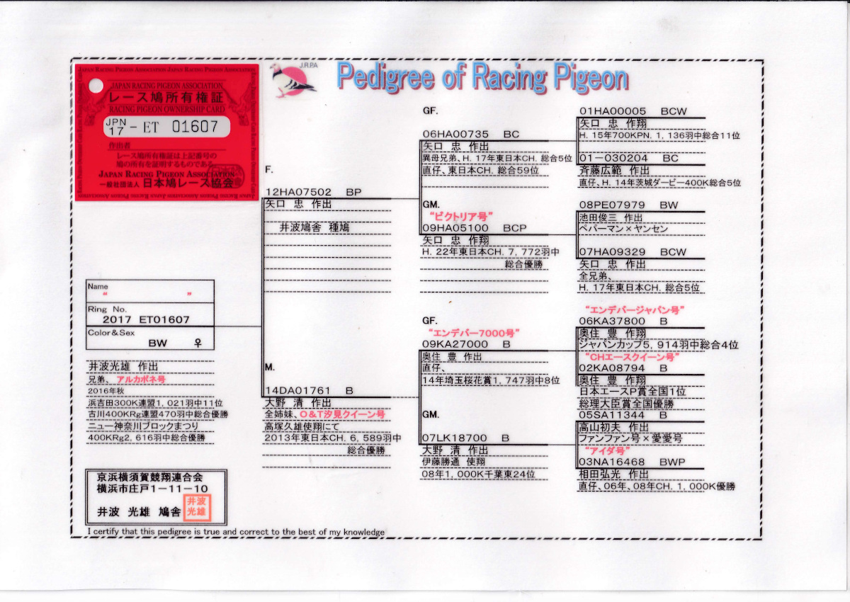 出品鳩♀4番「17ET01607 BW♀」井波光雄作 全兄弟)アルカポネ号ブロック400K総合優勝 矢口作東日本CH総合優勝直仔×大野作東日本CH総合優勝全姉妹 ![]() |