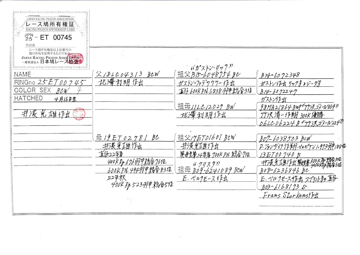 出品鳩若25番「25ET00745 BCW」井波作半兄弟)秋RG総合5位 PN総合3位半兄弟(カースブーア近親直仔×PN総合7位半兄弟(ファンダイク作翔×スプリント号孫) ![]() |