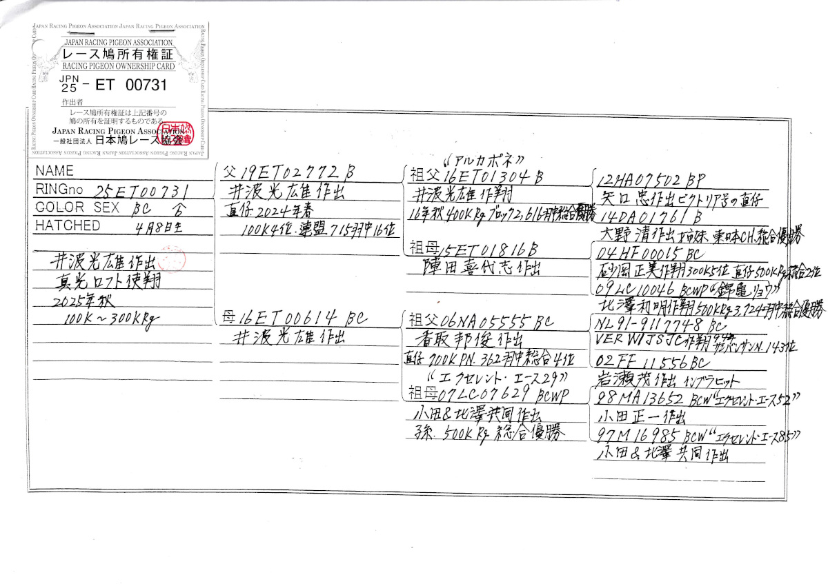 出品鳩若17番「25ET00731 BC」井波光雄作(アルカポネ号ブロック400K2616羽総合優勝×錦亀リョウ号RG総合優勝娘)×錦亀リョウ号RG500K3724羽総合優勝娘鳩 ![]() |