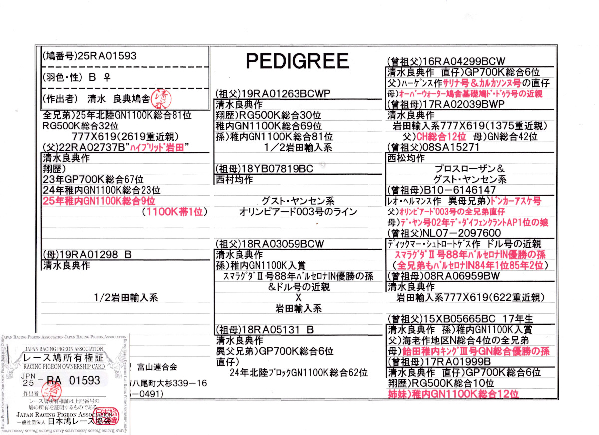 出品鳩若12番「25RA01593 B」清水良典鳩舎作翔25北陸GN1100K総合81位 RG500K総合32位 岩田(777×619)2619重近親鳩で ハイブリッド岩田号25年北陸稚内GN1100K総合9位(1100k地帯1位)24年北陸GN総合23位鳩の直仔で 3代稚内GN1100k入賞鳩の三代目鳩です。 父親 ♂39番"ハイブリッド岩田号"「22RA02737 B ♂」清水良典鳩舎作翔25年北陸稚内GN1100K総合9位(1100k地帯1位)24年北陸GN総合23位鳩で 直仔も北陸GN1100K総合81位入賞している 3代稚内GN1100k入賞鳩の二代目鳩です。 母親 「19RA01298 B」清水良典鳩舎作 異父兄弟に北陸GN総合62位鳩がいる (バルセロナIN優勝の孫&ドル号の近親X岩田輸入系)直仔XGP総合6位異父兄弟(飴田稚内キングV号の曾孫X岩田輸入系RG500K総合10位)鳩 との直仔です。 詳しくは、血統書を参照してください。 <備考> 現在管理人の鳩舎で元気に暮らしています。写真3/13日に撮影しました。 菅原明鳩舎の概要はこちらをご覧ください |