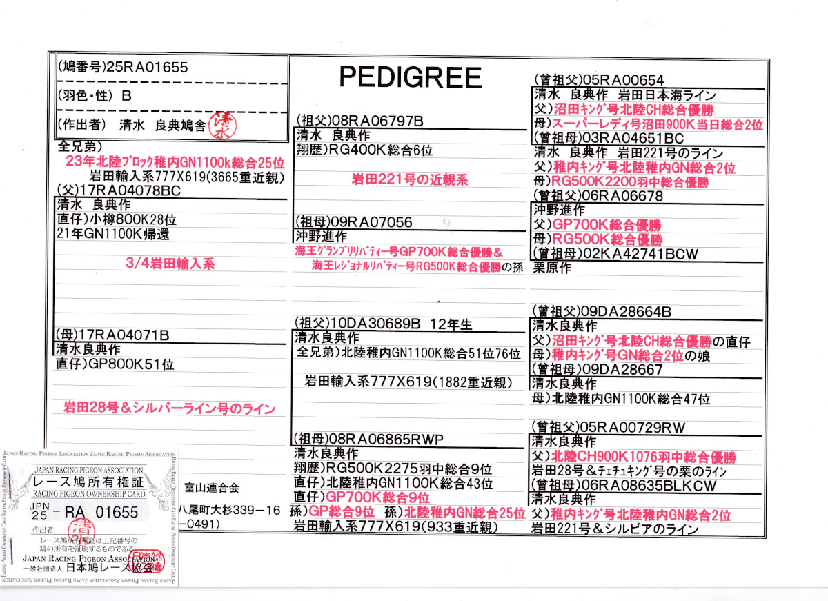 出品鳩若48番「25RA01655 B」清水良典作全兄弟)23年北陸GN1100K総合25位半兄弟)小樽800K28位鳩GP800k51位 岩田輸入系(777×619)3665重近親 ![]() |