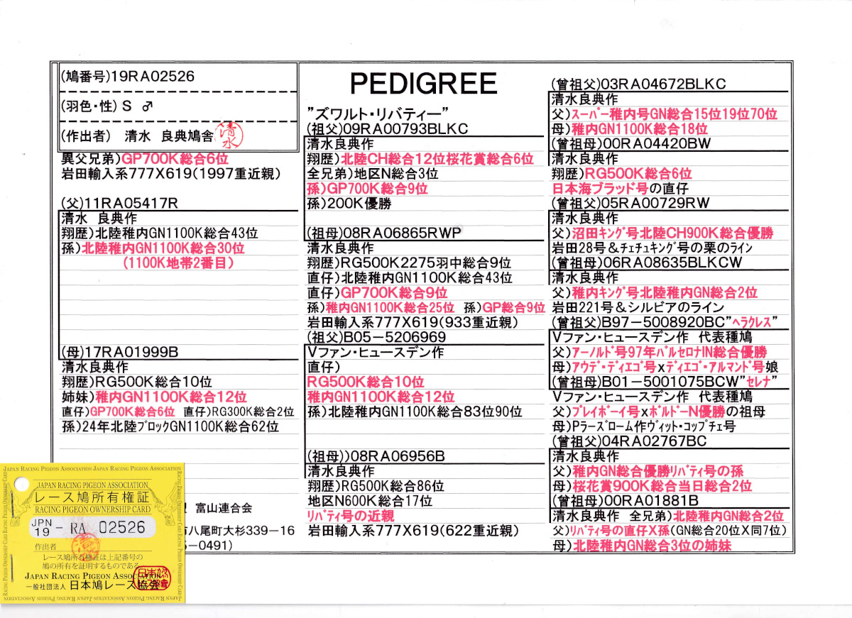 出品鳩♂27番「19RA02526 S♂」清水良典作半兄弟)RG総合2位鳩GP総合6位鳩 北陸GN総合43位(ズワルト・リバティ号直仔)×RG総合10位(兄弟GN総合12位) ![]() |