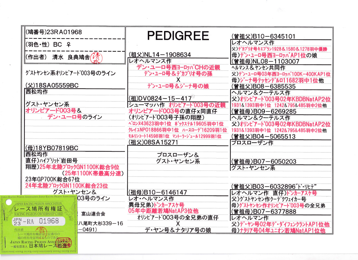 出品鳩♀51番「23RA01968 BC ♀」清水良典鳩舎作直仔にRG300K総合3位鳩がいる ハイブリット岩田号北陸GN1100K総合9位23位鳩の異父兄弟鳩で 両親西村作オリンピアード003号近親鳩です。 父親 「18SA05559 BC」西松 均鳩舎作 レオ・ヘルマンズ作(デンユーロ号西ヨーロッパCH鳩&デカプリオ号の孫Xデンユーロ号の娘)直仔Xシューマッパ作(銘鳩オリンピアード003号の直仔X銘鳩オリンピアード003号の娘)娘鳩 との直仔です。 母親 「18YB07819 BC」西松 均鳩舎作 直仔に ハイブリット岩田号北陸GN1100K総合9位23位鳩がいる プロス・ローゼン&グストヤンセン系Xレオヘルマン作中距離若鳩NatエースP3位の異母兄弟(オリンピアード003号全兄弟の直仔Xデ・ヤン号の娘)娘鳩 との直仔です。 詳しくは、血統書を参照してください。 <備考> 現在管理人の鳩舎で元気に暮らしています。写真3/13日に撮影しました。 菅原明鳩舎の概要はこちらをご覧ください |