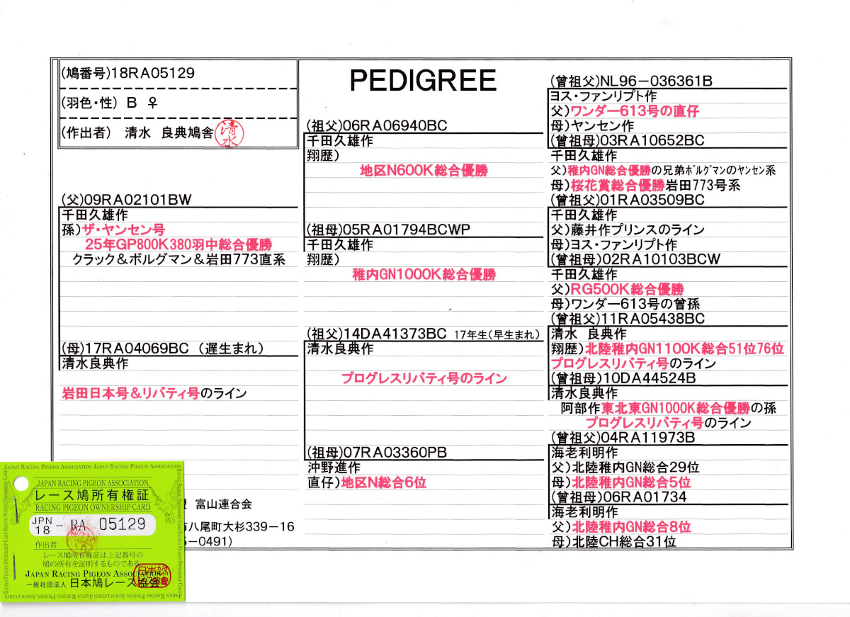 出品鳩♀19番「18RA05129 B♀」清水良典作千田作(PN総合優勝X北陸GN1000K総合優勝)×日本海号&リバティー号ライン(稚内GN1100K総合51位76位孫) ![]() |