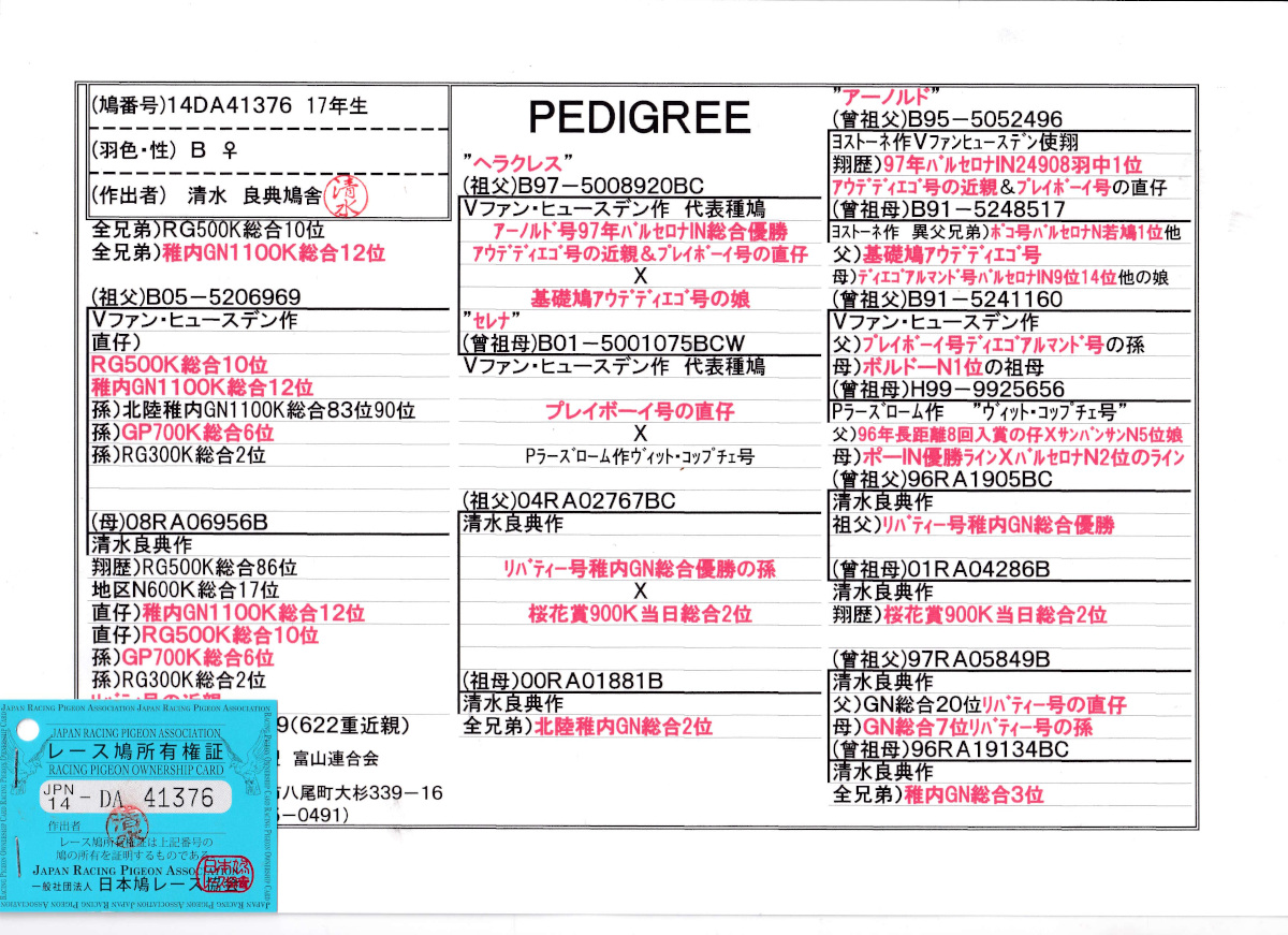 出品鳩♀8番17年生「14DA41376 B♀」清水良典作全兄弟)RG500K総合10位鳩稚内GN1100k総合12位鳩 アーノルド号孫×PN総合17位&シバティ号近親 ![]() |