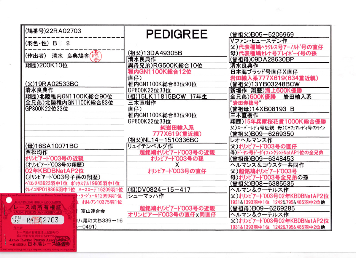 出品鳩♀45番「22RA02703 B♀」清水良典作翔200K10位 21年北陸稚内GN1100k総合90位鳩×西松作 銘鳩オリンピアード003号近親鳩 ![]() |