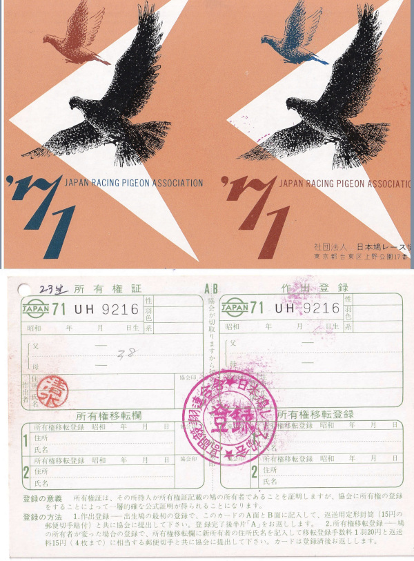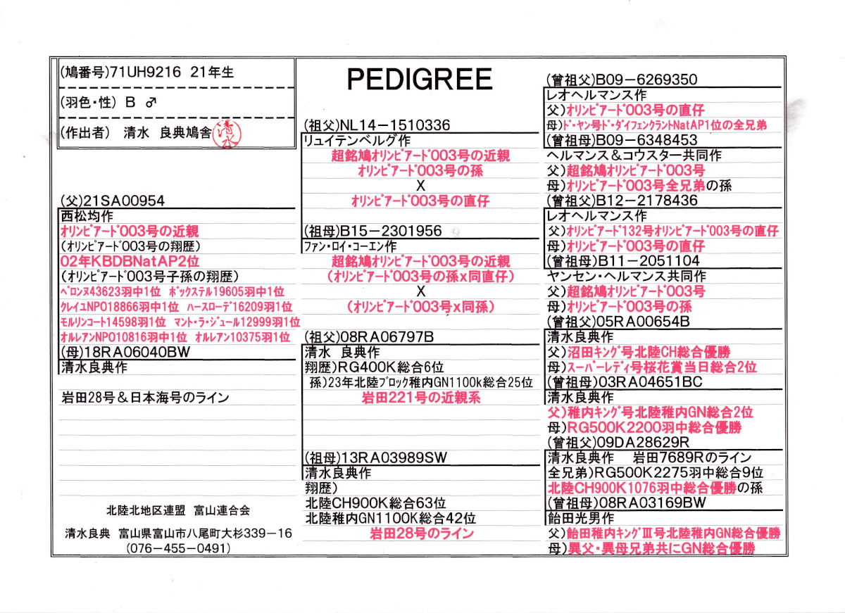 出品鳩♂3番21年生「71UH9216 B♂」清水良典作 西松作銘鳩オリンピアード003号近親(近親孫×近親孫)X岩田系(RG400K総合6位×北陸GN1100K総合42位) ![]() |