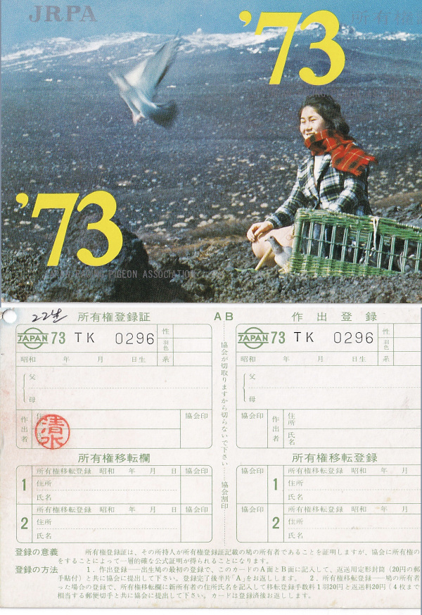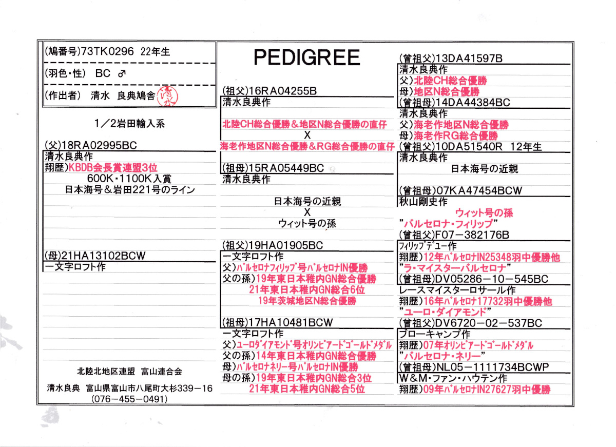 出品鳩♂6番22年生「73TK0296 BC♂」清水作KBDB会長賞3位日本海号岩田221号ライン×(バルセロナフイリップス号ラマスターバルセロナ直仔×ユーロ号ネリー号娘) ![]() |