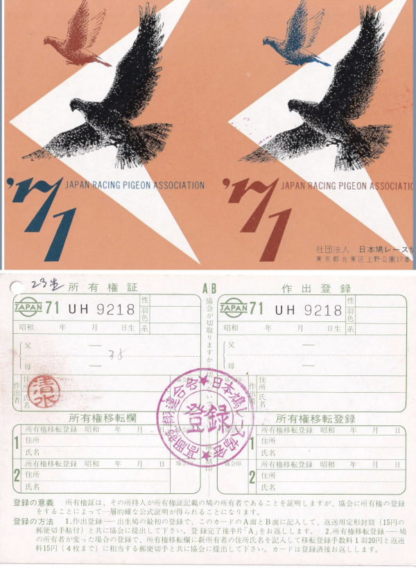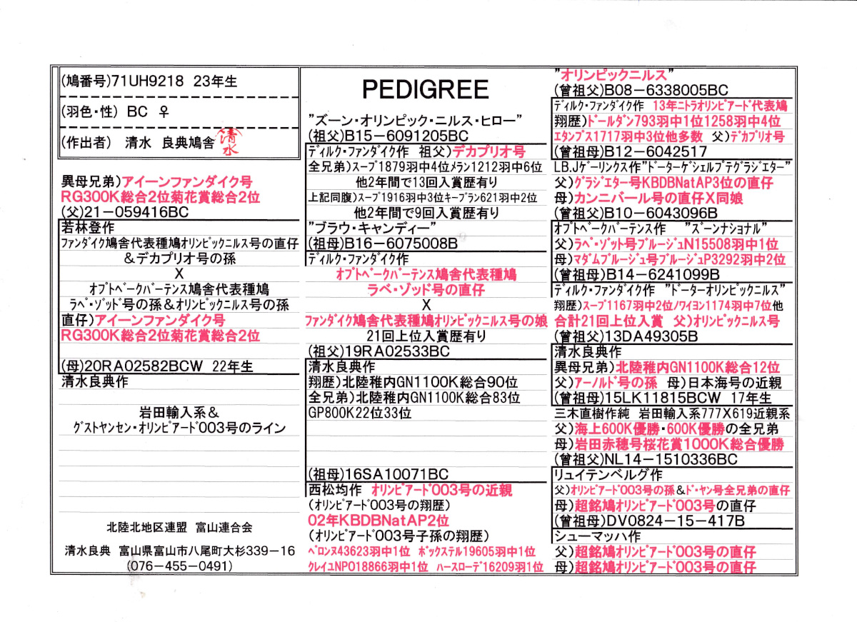 出品鳩♀5番23年生「71UH9218 BC♀」清水作半兄弟)秋RG&菊花賞総合2位 オリンピックニルス近親孫×(GN1100K総合90位×オリンピアード003号近親) ![]() |