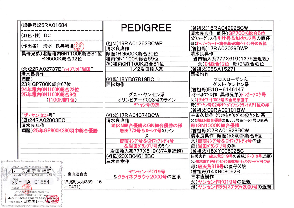 出品鳩若74番「25RA01684 BC」清水良典鳩舎作半兄弟)北陸GN1100K総合81位 ハイブリッド岩田号北陸稚内GN総合9位総合23位×ザヤンセン号北陸GP800k総合優勝鳩 ![]() |