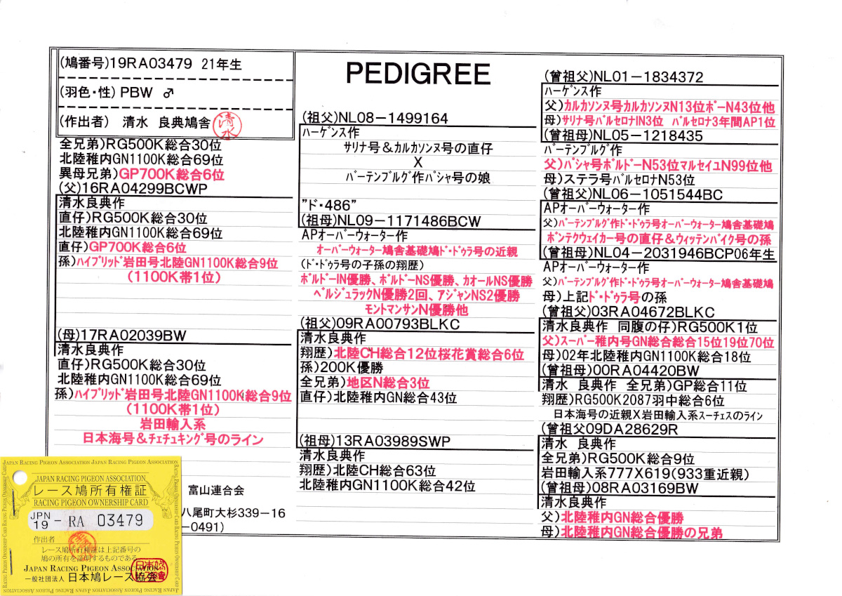出品鳩♂30番21年生「19RA03479 PBW♂」清水作全兄弟)RG総合30位GN総合69 (サリナ号孫Xオーバーウォター作)×(777×619)1375近親 ![]() |