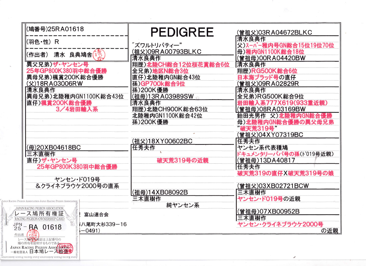 出品鳩若25番「25RA01618 R」清水作半兄弟)ザヤンセン号北陸GP総合優勝アイーン200号楓賞総合優勝岩田(777×619)1375重近親×(破天荒ヤンセン×純ヤンセン系) ![]() |