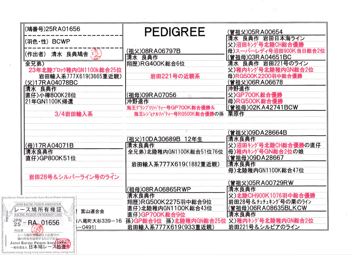 出品鳩若49番「25RA01656 B」清水良典作全兄弟)23年北陸GN1100K総合25位半兄弟)小樽800K28位鳩GP800k51位 岩田輸入系(777×619)3665重近親 ![]() |