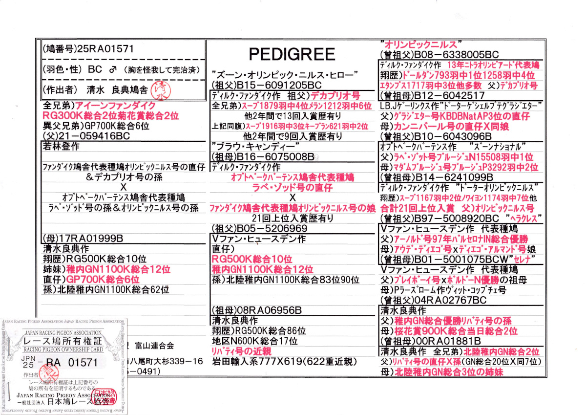 出品鳩若1番「25RA01571 BC」清水作全兄弟)秋RG&菊花賞総合2位半兄弟)GP総合6位 オリンピックニルス近親孫×RG500K総合10位(全兄弟GN総合12位) ![]() |