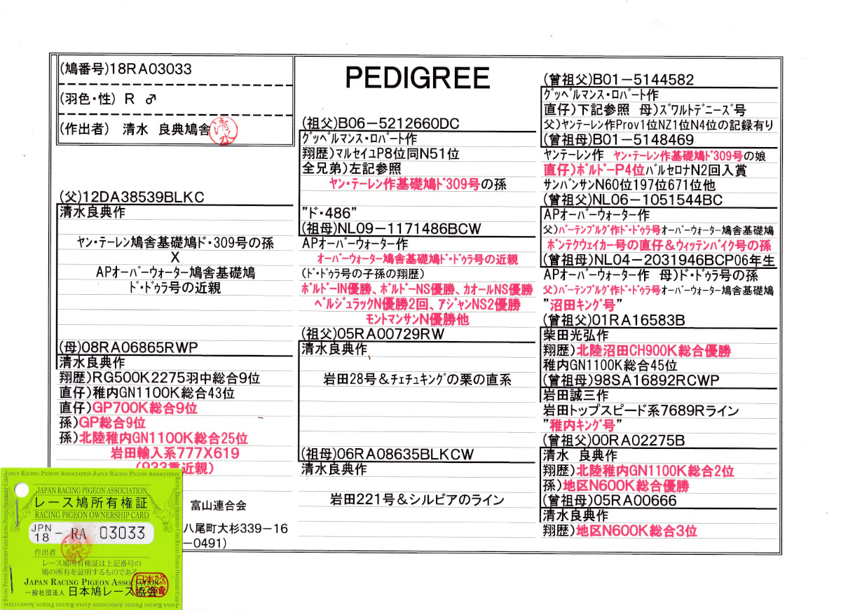 出品鳩♂18「18RA03033 R♂」清水良典作半兄弟)GP700K総合9位北陸GN1100K総合43位(マルセイユN51位Xオーバーウォーター基礎鳩ドドゥラ号近親)×RG総合9位 ![]() |