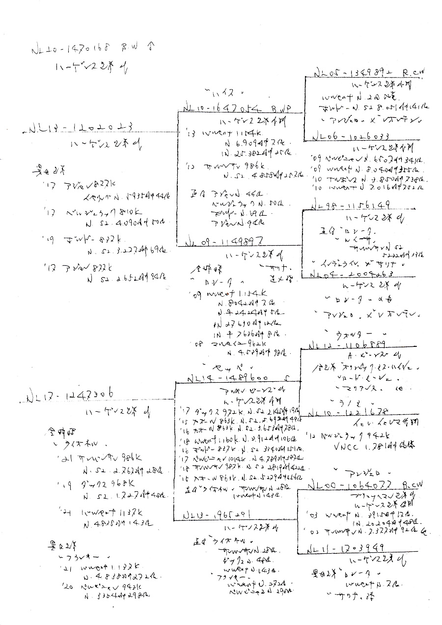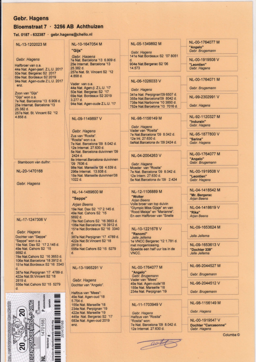 出品鳩「NL20−1470168 BW ♂」ハーゲンス兄弟鳩舎作(ハイス号バルセロナN7位IN25位 ×ロシータ号バルセナN7位IN12位の全兄弟)直仔×ランオネル号サンバンサンS2N28位バルセロナN143位全兄弟(セッペ号ダックスS2N9位バルゼロナN106位の娘)鳩 との直仔です。 父親 「NL13−1202023」ハーゲンス兄弟鳩舎作(ハイス号バルセロナN6909羽7位IN25382羽25位 ×ロシータ号バルセナN8042羽7位IN27630羽12位の全兄弟鳩 との直仔です。 母親 「NL17−1247306」ハーゲンス兄弟鳩舎作 全兄弟ランオネル号サンバンサンS2N28位ダックスS2N48位バルセロナN143位鳩がいる セッペ号ダックスS2N9位バルゼロナN106位(オリンピックミスハイシェ全兄弟直仔)×アンジェロ号の娘鳩 との直仔です。 詳しくは、血統書を参照してください。 <備考> 現在管理人の鳩舎で元気に暮らしています。写真3/20日に撮影しました。 菅原明鳩舎の概要はこちらをご覧ください |