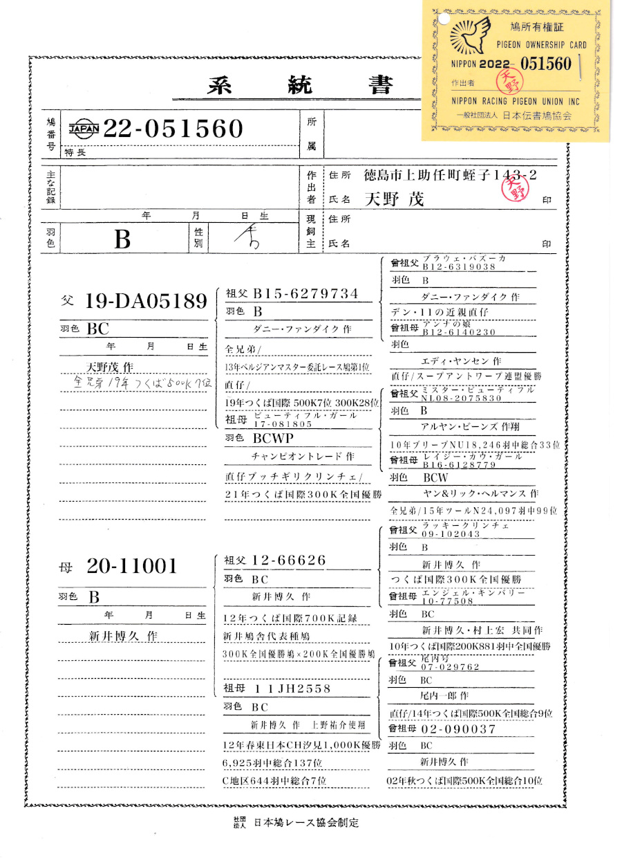 | 出品鳩「22−051560 B♂」天野 茂作両親新井作委託鳩舎飛び筋 つくば国際500k7位全兄弟×(つくば国際700k記録×上野翔東日本CH優勝C地区644羽7位) | オークションNo: 1774072825 |