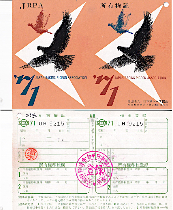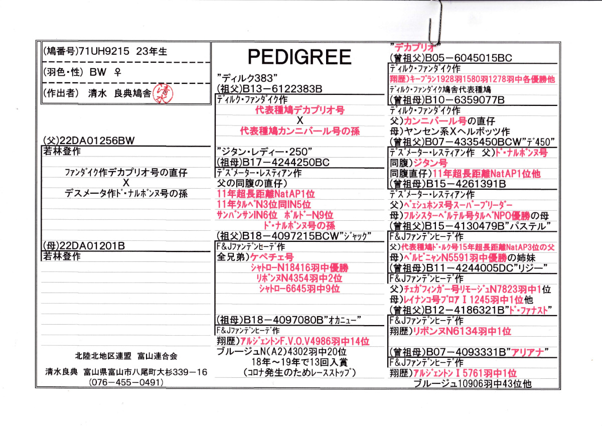 出品鳩♀4番23年生「71UH9215 BW♀」清水作 (デカプリオデ直仔×ジダン同腹娘)×両親ファンデヒーデ作(シャトローN優勝兄弟×アルジェントン4986羽14位) ![]() |