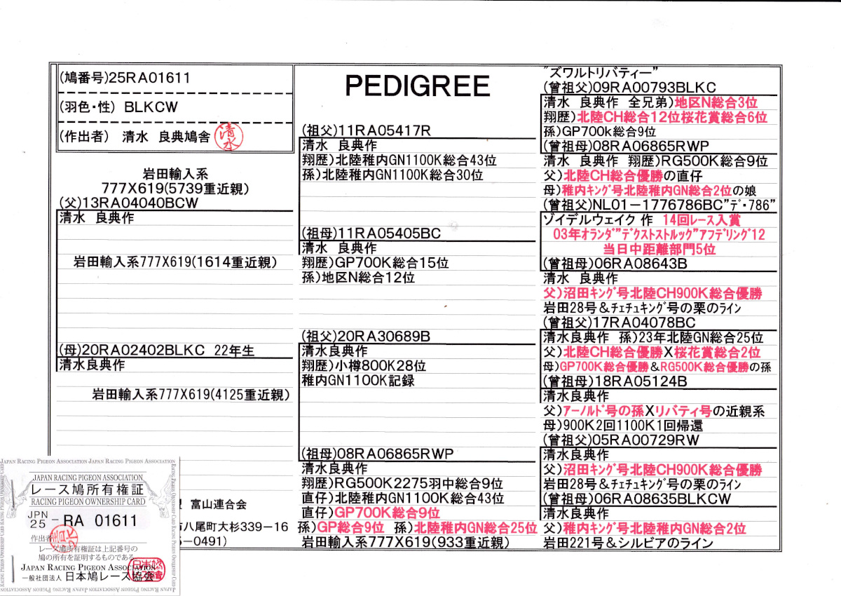 出品鳩若21番「25RA01611 BLKCW」清水良典作岩田輸入系(777×619)5739重近親(北陸稚内GN1100K総合47位XGP総合15位)×(800k28位1100K×RG総合9位) ![]() |