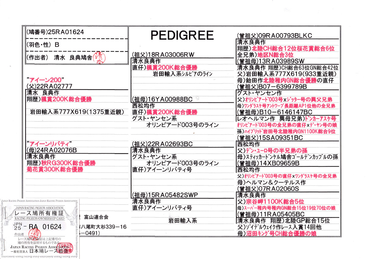 出品鳩若29番「25RA01624 B」清水良典作アイーン200号楓賞総合優勝岩田(777×619)1375近親×アイーンリバティ号秋RG&菊花賞総合優勝岩田(777×619)1023近親 ![]() |