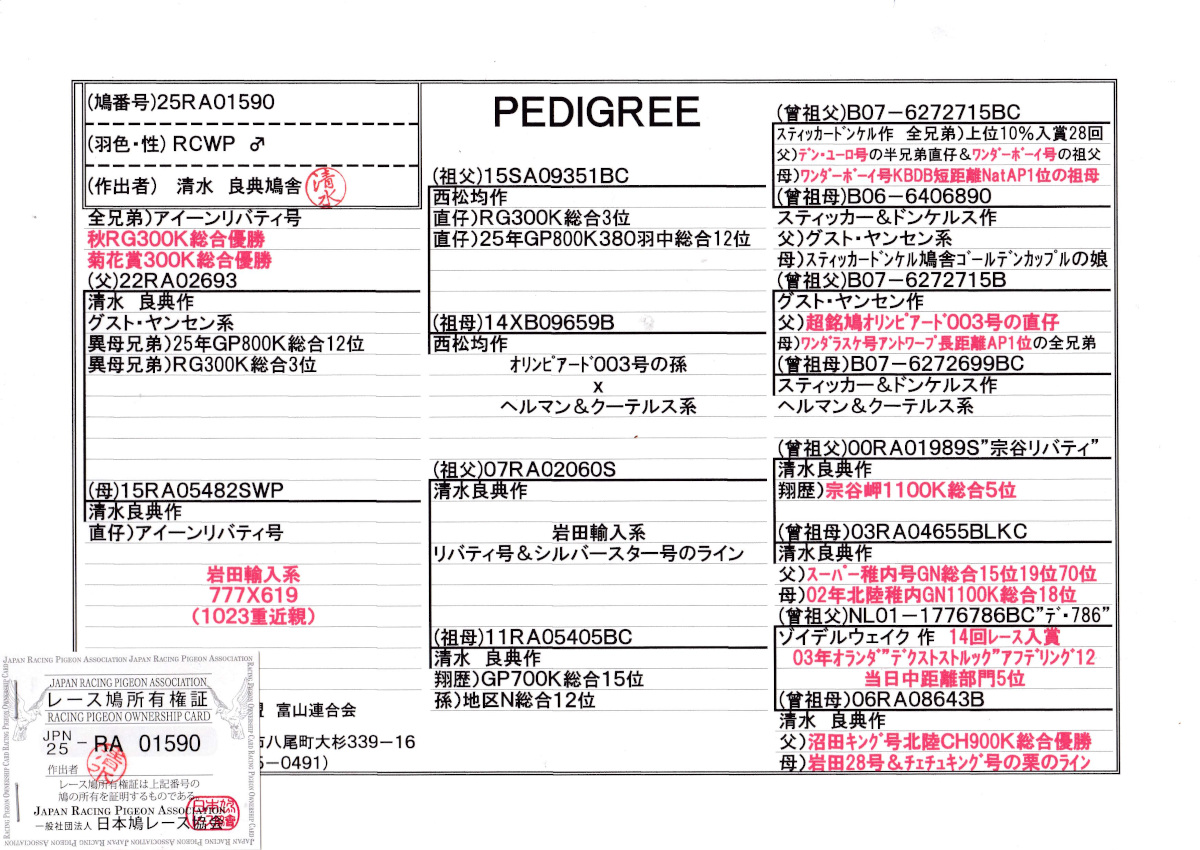 出品鳩若11番「25RA01590 RCWP」清水良典鳩舎作 アイーンリバティ号24年秋RG300K総合優勝菊花賞300K総合優勝の全兄弟鳩で グスト・ヤンセン系×岩田輸入系(777×619)1023重近親鳩 との直仔です。 父親 ♂36番「22RA02693 BCW ♂」清水良典鳩舎作直仔にアインリバティ号24年秋RG300K総合優勝菊花賞総合優勝 異母兄弟に 25年北陸GP800K380羽中総合12位 RG300K総合3位鳩がいる 両親ドンケルス作上位10%入賞28回中距離AP3位全兄弟の直仔 ×グストヤンセン作銘鳩オリンピアード0003号ライン鳩 との直仔です。 母親 ♀13番「15RA05482 SWP ♀」清水良典鳩舎作直仔にアインリバティ号24年秋RG300K総合優勝菊花賞総合優勝鳩がいる 岩田輸入系(777×619)1023重近親鳩(宗谷リバティ号1100K総合5位Xスーパー稚内号北陸GN1100K総合15位19位70位の娘直仔×GP700K総合15位(オランダ地方当日AP中距離部門5位×沼田キング号北陸CH総合優勝の娘)鳩 との直仔です。 詳しくは、血統書を参照してください。 <備考> 現在管理人の鳩舎で元気に暮らしています。写真3/26日に撮影しました。 菅原明鳩舎の概要はこちらをご覧ください |