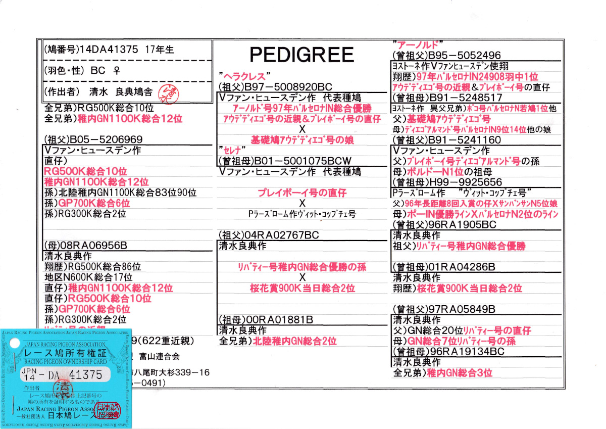 出品鳩♀7番17年生「14DA41375 BC♀」清水良典作全兄弟)北陸GN1100K総合12位鳩RG500K総合10位鳩 アーノルド号孫×PN総合17位&シバティ号近親 ![]() |