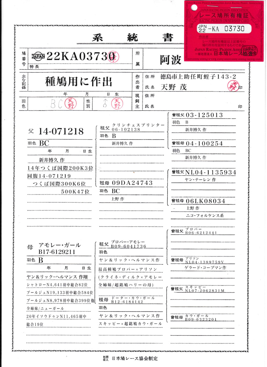 出品鳩「22KA03730 BC♂」天野作直仔)伊賀200k11位12位つくば200k3位(同腹つくば300k6位&クリンチェスプリンター号直仔)×アモーレガール号シャトローN82位 ![]() |