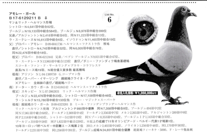 出品鳩「22KA03730 BC ♂」天野 茂鳩舎作直仔に伊賀国際200K11位12位鳩がいる 新井作つくば国際200k3位(同腹つくば国際300k6位500k47位鳩&飛び筋クリンチェスプリンター号直仔)×アモーレガール号ヘルマンス作翔 シャトローN4641羽総合82位鳩 との直仔です。 父親 「日14−071218 BC」新井博久鳩舎作委託 つくば国際200k3位 同腹もつくば国際300k6位500k47位鳩がいる 飛び筋クリンチェスプリンター号 × 上野作(ヤン・テーレン作鳩×ニコ・フェルケンス系)娘鳩 との直仔です。 母親 "アモーレガール号"「B17−6129211 B」ヤン&リック・ヘルマンス鳩舎作翔 シャトローN4641羽総合82位ブールジュN19133羽584位8978羽399位鳩で 最高種鳩プロパー号直仔×超銘鳩カウガール号娘鳩 との直仔です。 詳しくは、血統書を参照してください。 <備考> 現在管理人の鳩舎で元気に暮らしています。写真3/26日に撮影しました。 菅原明鳩舎の概要はこちらをご覧ください |