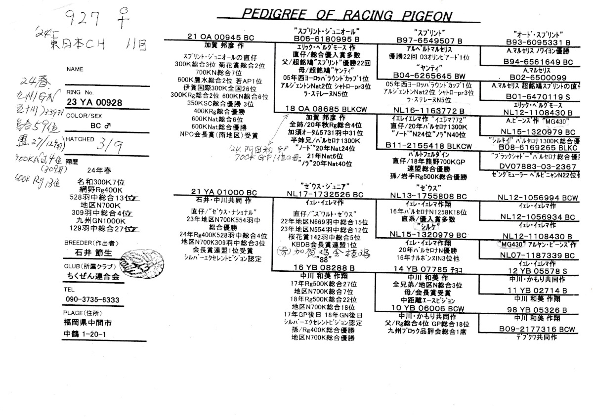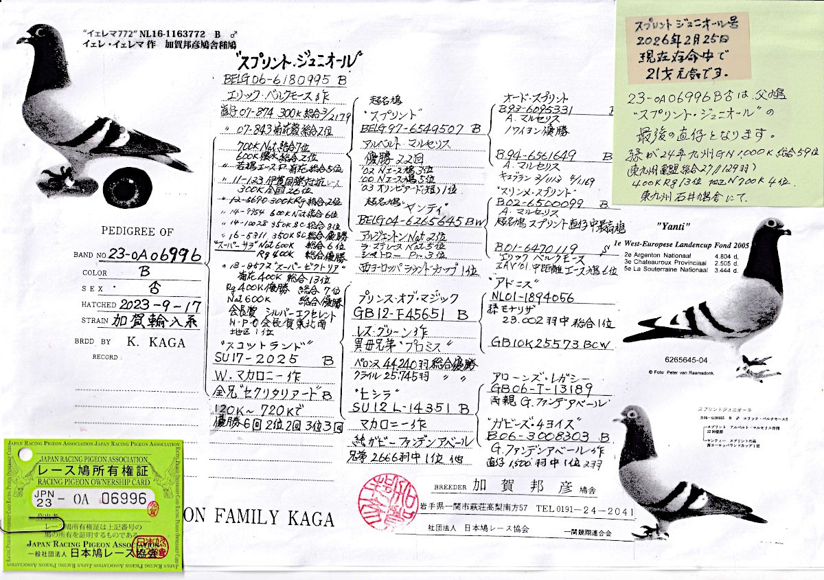 出品鳩「23OA06996 B♂」加賀邦彦作加賀輸入系異母兄弟)総合優勝3回総合2位3回他シルバーエクセレントP鳩 マリセリス鳩舎銘鳩スプリント号孫鳩 ![]() |