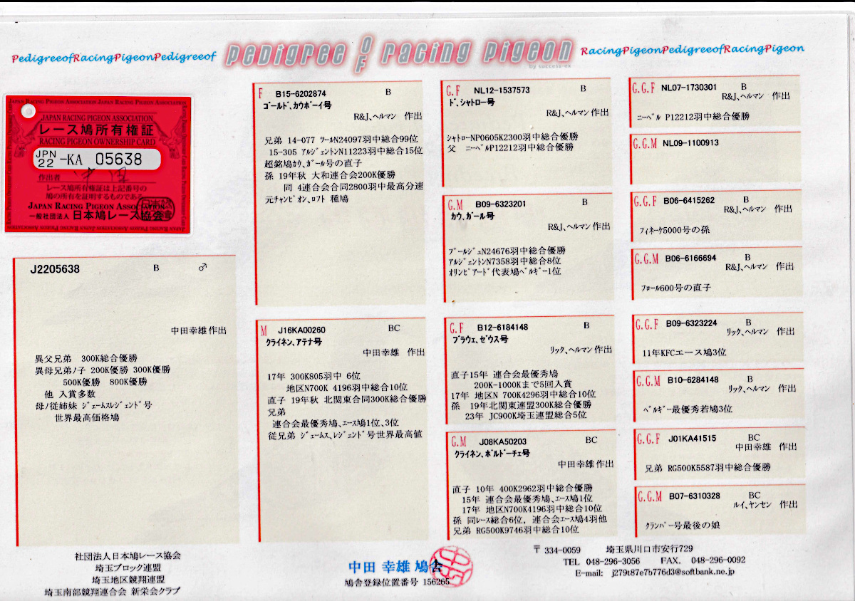 出品鳩「22KA05638 B♂」中田作半兄弟)北関東合同300k総合優勝ゴールドカウボーイ号(超銘鳩カウ・ガール号直仔)×クライネンアテナ号PN700k4196羽総合10位 ![]() |