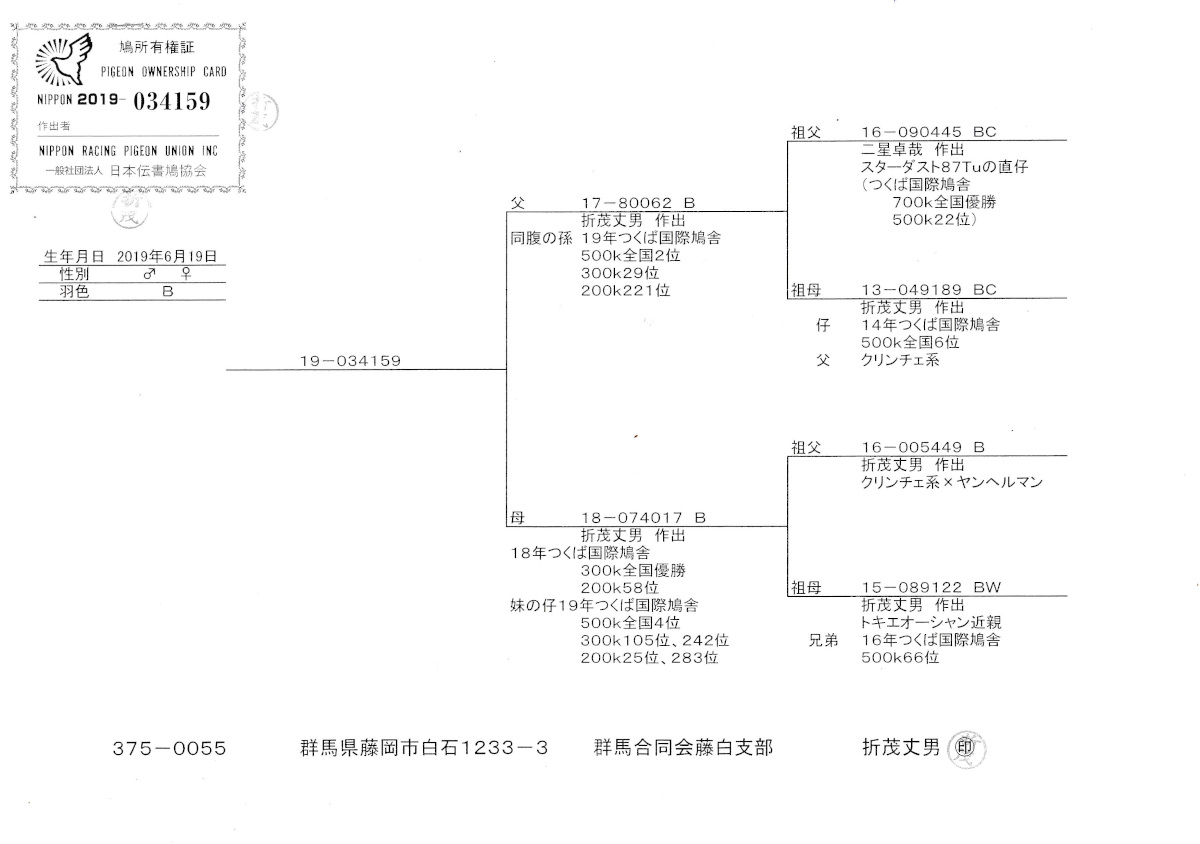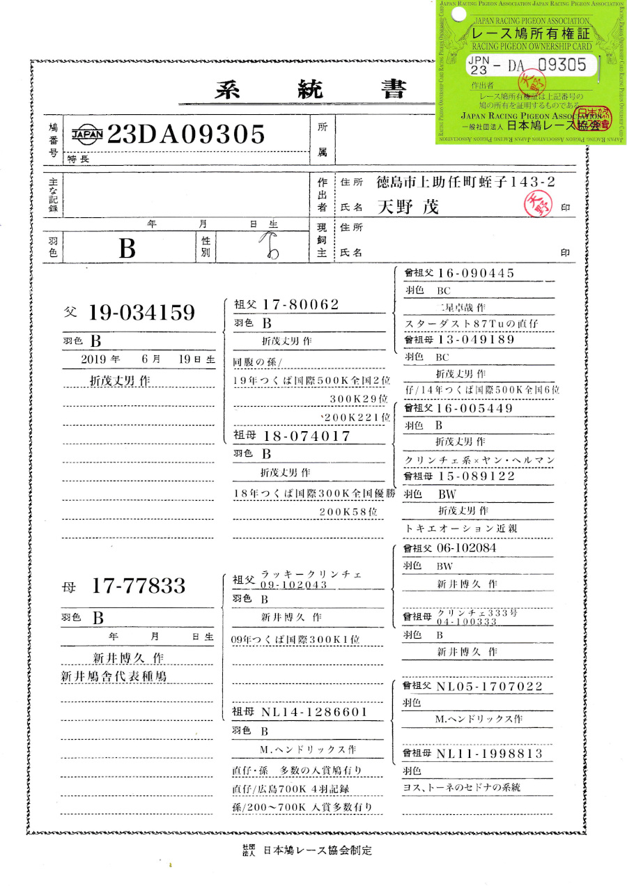 出品鳩「23DA09305 B♂」天野 茂作折茂作18年つくば国際300K全国優勝の直仔×新井作ラッキークリンチェ号つくば国際300K全国優の娘鳩 ![]() |